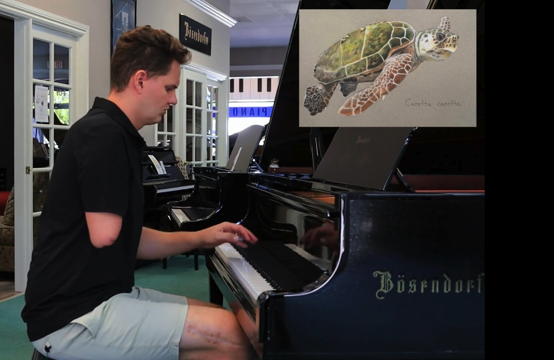 Carter adjusted to playing piano with one hand, and he draws sea life.