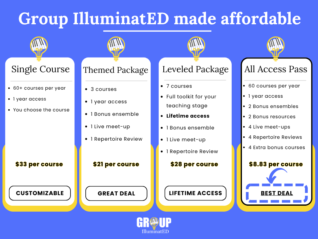 Since Group IlluminatED courses cover various experience levels of group teaching, we’ve reorganized the content to simplify your decision-making process. This way you can zoom in on what YOU need.