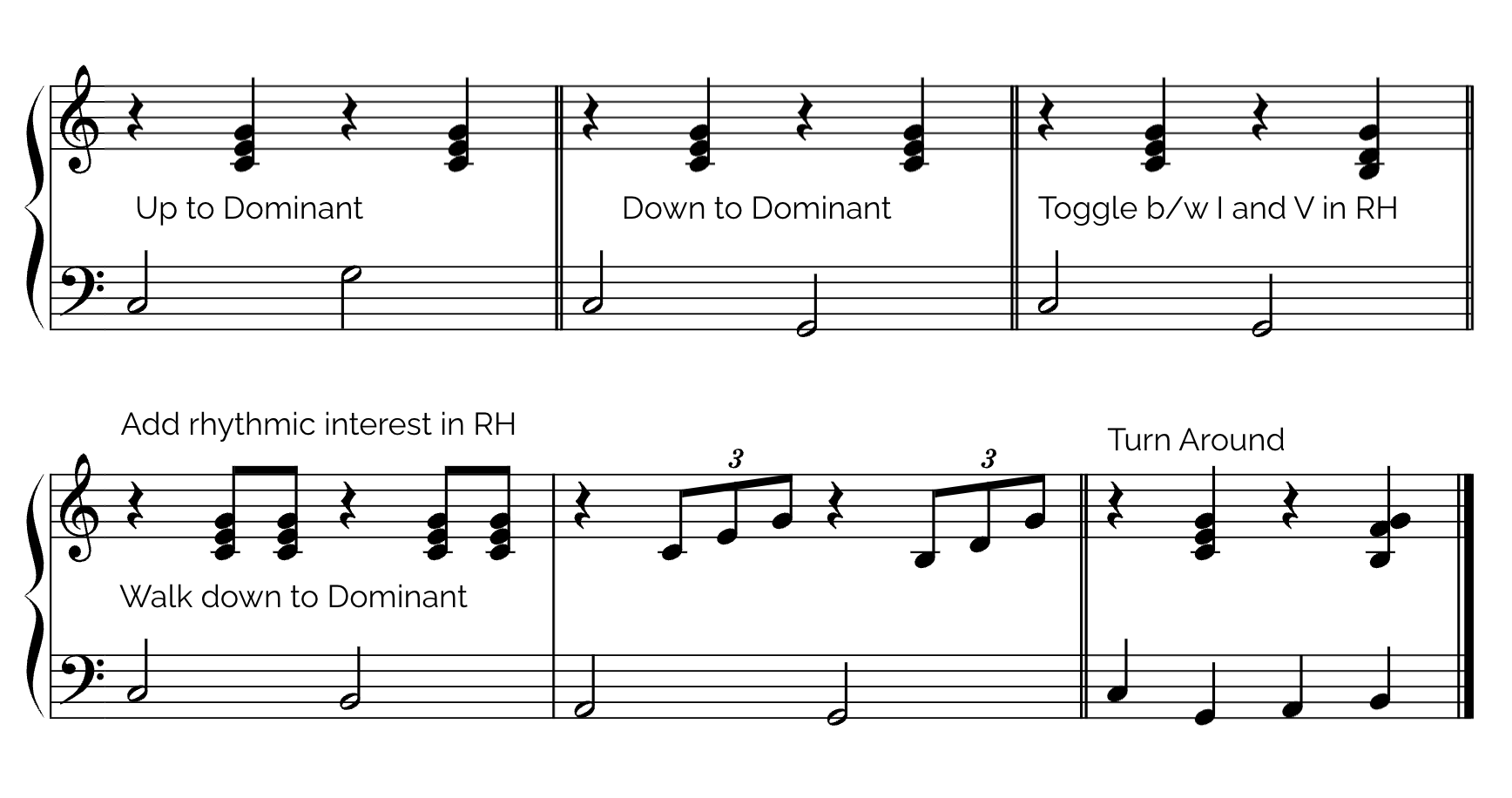 To ramp up your vamp, walk down to the Dominant and play the V or Dominant chord in the right hand.