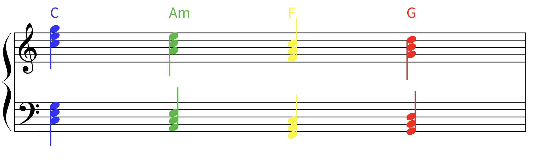 Credit for the color coding goes to me—primary chords pair nicely with primary colors.)