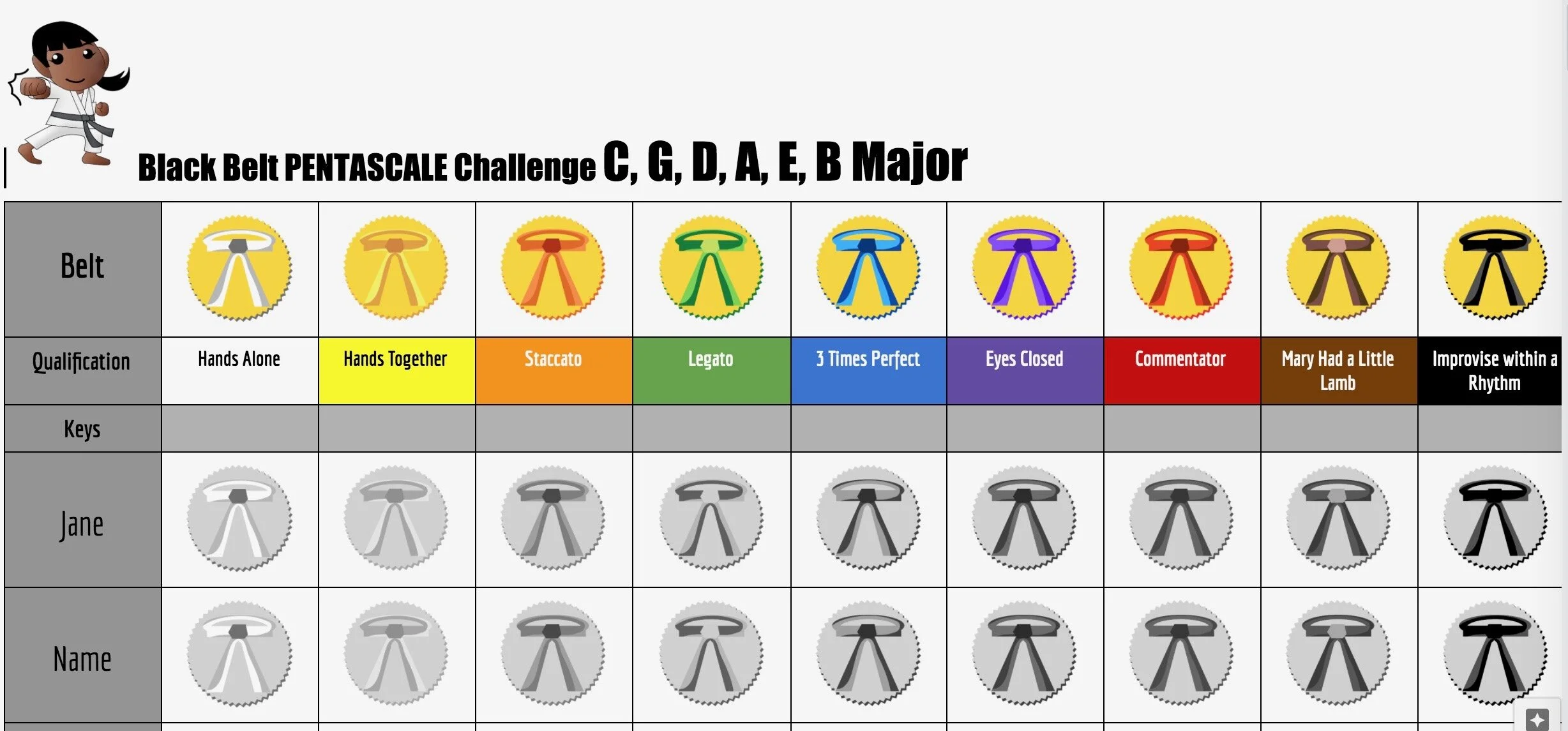 Use and modify pre-made digital badge boards to track progress in playing pentascales and scales.